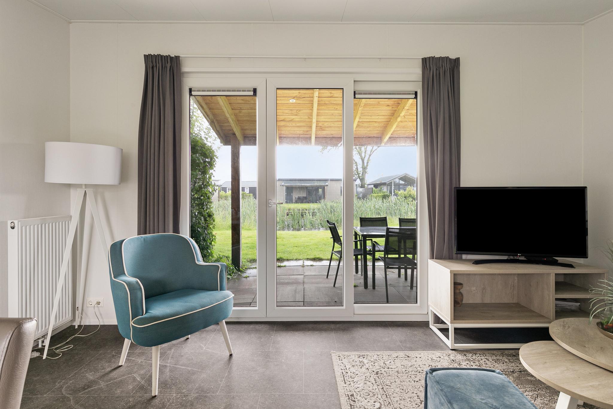 Bij binnenkomst valt direct de lichte en ruime opstelling van dit chalet op. De moderne donkere vloer is zeer net afgewerkt en geeft het gehele chalet een luxe uitstraling. Na de open hal betreed je direct de open woon- en eetkamer met open keuken. De openslaande deuren leiden naar de overkapping in de tuin. De deuren zorgen samen met het grote raam aan de andere zijde voor veel natuurlijk lichtinval. De keuken beschikt over een vierpits kookplaat, combimagnetron, afzuigkap, wastafel met mengkraan, grote inbouw koel- vriescombinatie en vaatwasser. De kamer heeft voldoende ruimte voor een ruime zithoek en een eethoek met plek voor minimaal 6 personen. Achter de eethoek bevinden zich de toegangsdeuren naar twee slaapkamers.